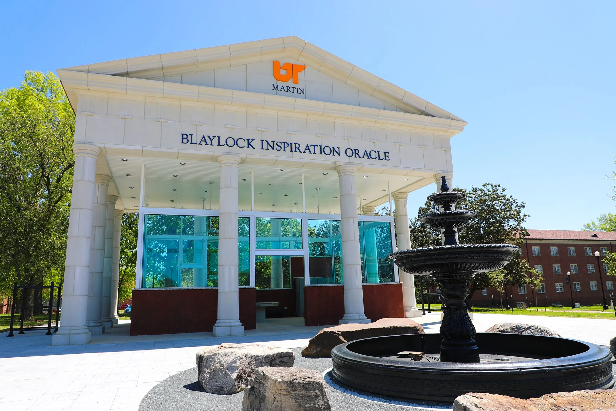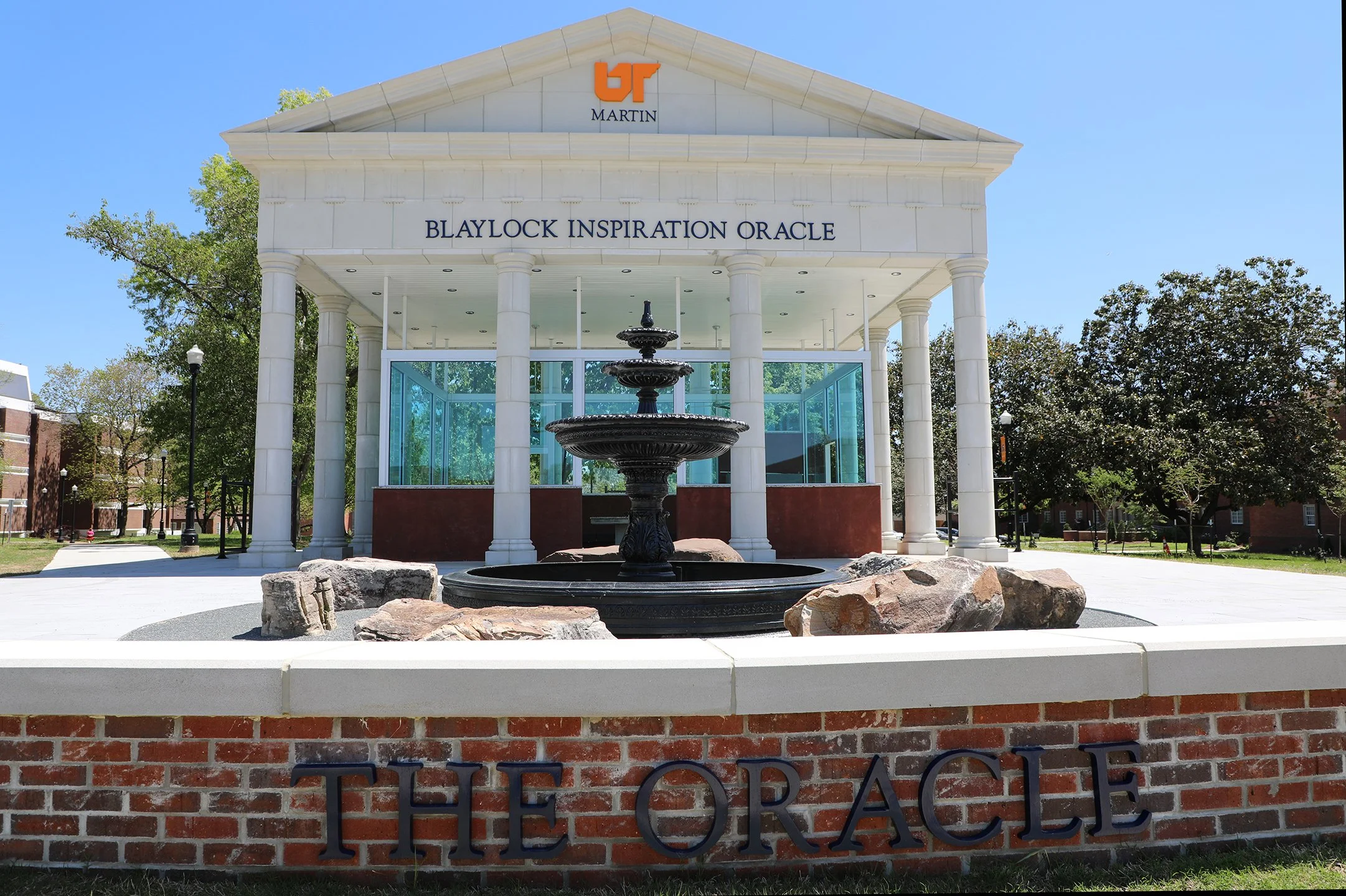 The plaza surrounding the oracle includes a grand water fountain and a seated wall. The oracle pays homage to Dr. Paul Blaylock, a distinguished 1968 graduate of UT Martin renowned for his four-decade tenure as a trauma physician and trial attorney in Portland, Oregon. It is located near the center of UT Martin’s campus, East of the Boling University Center.