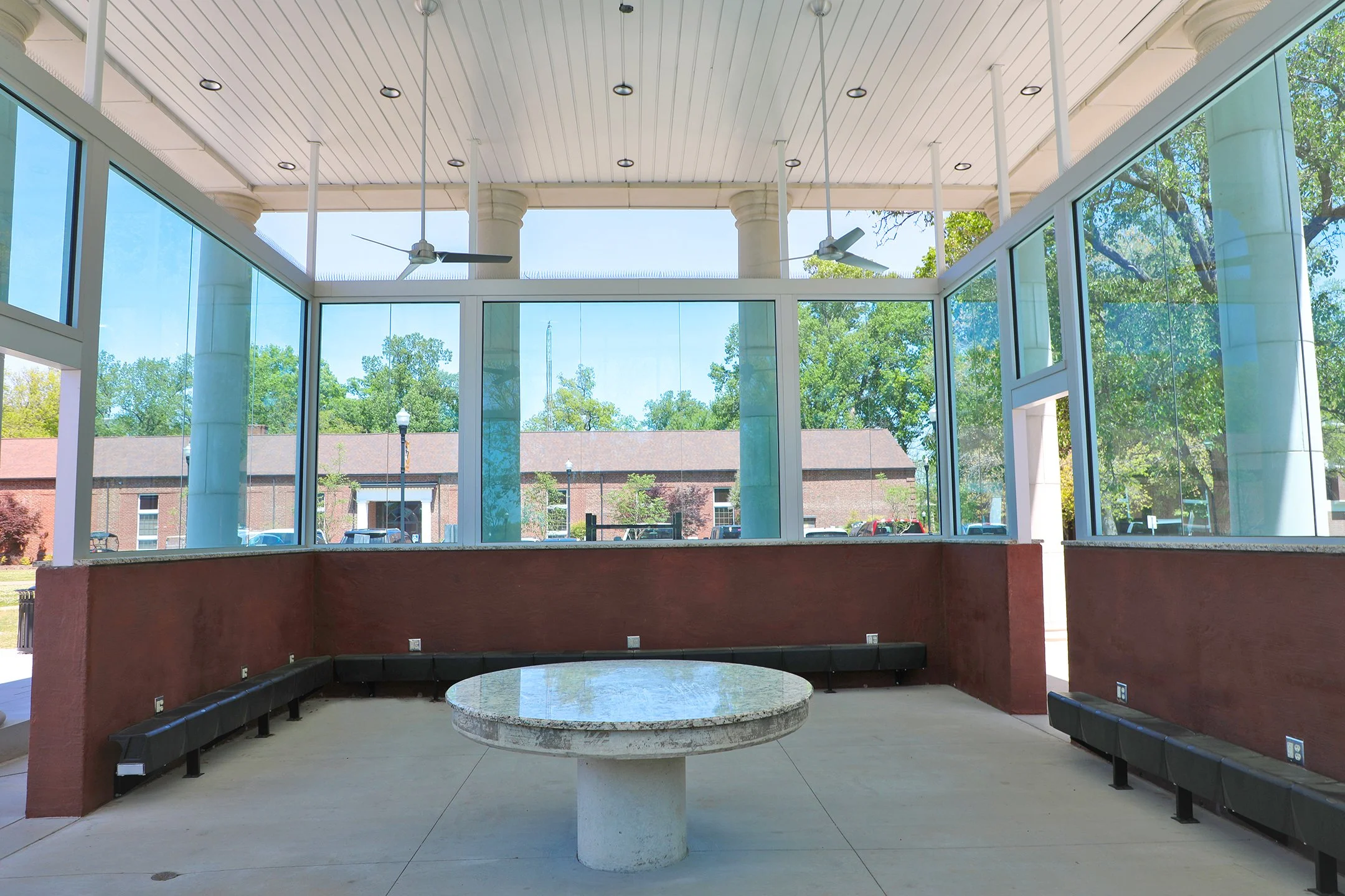 Its stunning, blue-tinted laminated glass panels allow for ample natural light inside, while a circular table with a beautiful granite countertop sits in the center of the classroom. Cushioned benches line the walls, creating a contemporary setting ideal for both learning sessions and social gatherings.